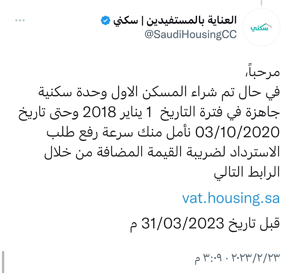 بدأ برنامج “سكني” ممثلاً عن وزارة الإسكان، بمبادرة يتم فيها تغطية ضريبة القيمة المضافة على المسكن الأول، إثر المرسوم الملكي الذي يطالب الدولة بتغطية تلك الضريبة على المسكن الأول، وعدم تجاوزها. 850 الف ريال.